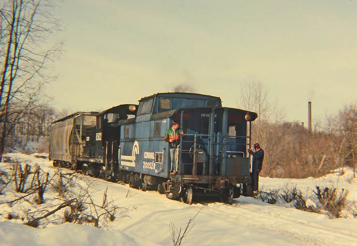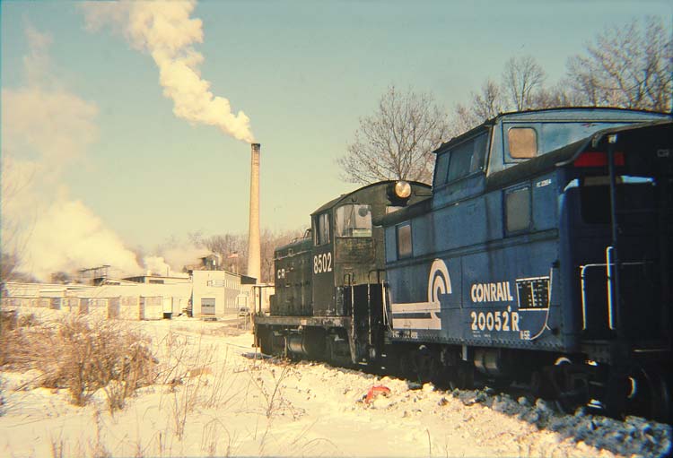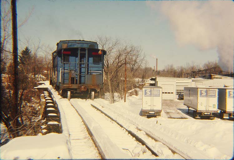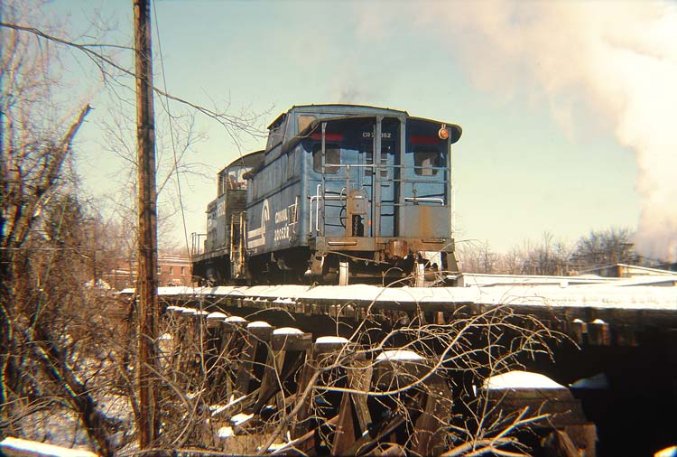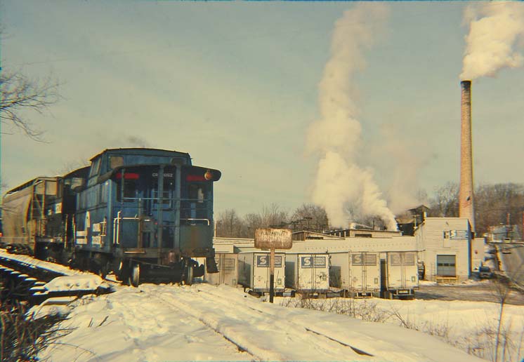 Another shot on the trestle. A covered-hopper has been picked up. The smokestacks for the former Mohawk Mills power plant is in the background. Another trestle was used to service the powerhouse. (PHOTO: Bill Mischler)