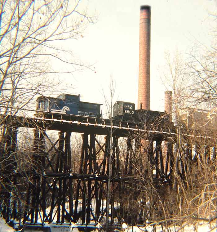 Here's the train on the massive trestle at Mohasco (Mohawk Mills). This SW-Unit was used due to the trestles at Mohawk Mills. (PHOTO: Bill Mischler)