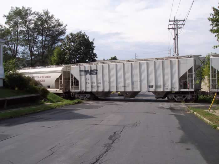 Here's cars being pushed across Vrooman Ave. The end of the branch is just to the right. The cars need to be pushed this far so they can hit the switch to go up to FGI