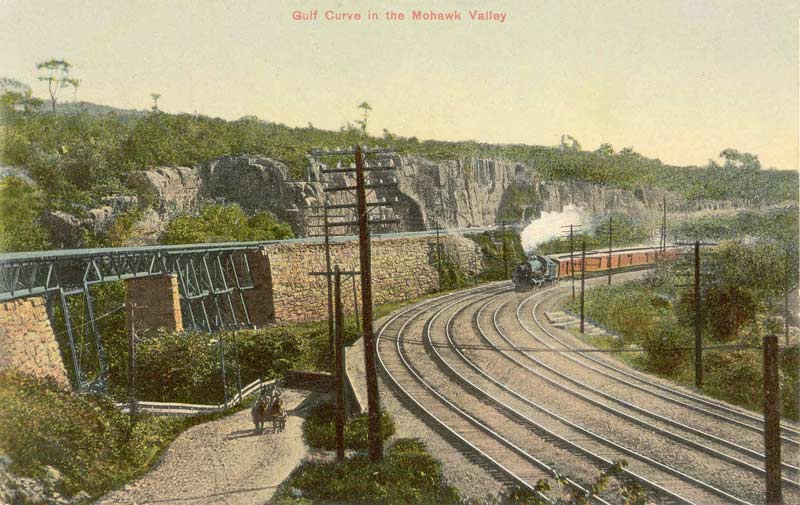 Here's the same view, this time a New York Central train is rounding the Gulf Curve. (Postcard: Jerry Snyder Collection)