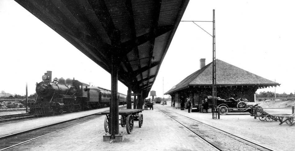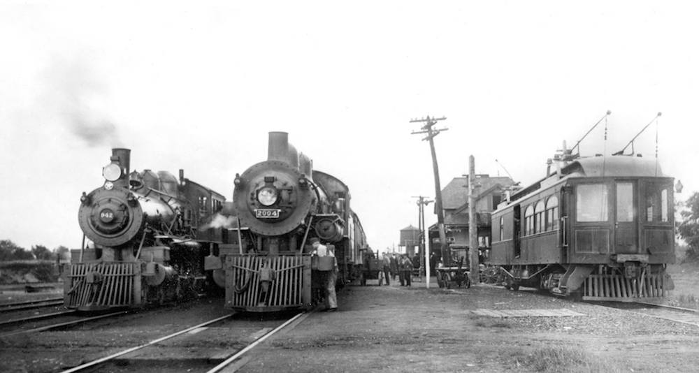 Paul Smith had a hotel and power company located in the heart of The Adirondacks. To get his guests to his hotel with ease and comfort, he built an electric railroad connecting To The New York Central Railroad at Lake Clear Junction and his Hotel, two miles away!![]() Lake Clear Junction Station. The interchange with the Paul Smith's Electric Railroad. Notice the overhead wire for his trolley on the right. (Tim Mayers Collection)![]() Same view, probably earlier than the image above. Now we see Paul Smith's trolley at the Lake Clear Station, but also some New York Central power. One for Saranac Lake and Lake Placid and the other for Malone and points North into Canada. (Tim Mayers Collection)![]() Paul Smith's Combo loco with a passenger coachLake Clear Junction on the Mohawk And Malone Railroad (New York Central's Adirondack Branch)![]() Paul Smith's Steam loco used for maintenance and building the line.![]() A conductor and motor-man posing with their car.![]() Paul's Smith's combo car and inspection car.![]() End of the line. This car would waste away in the woods until it was removed in the 1960's.![]() This lot full of autos is what ultimately doomed the trolley. | ||||