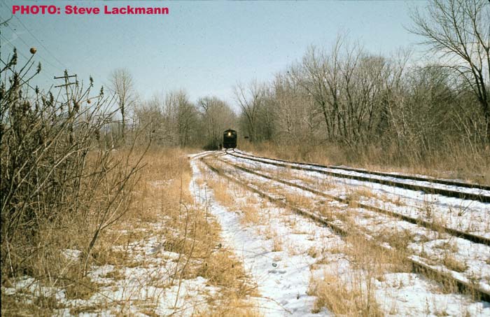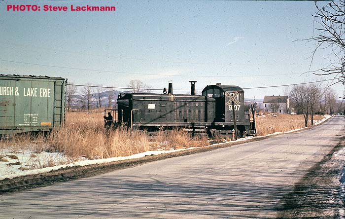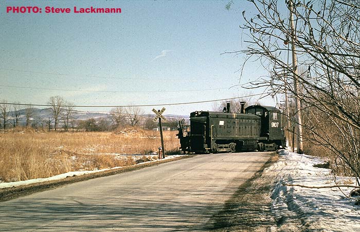 Here is PC switcher 9107 moving cars into the Ford plant off Fonda Road in Colonie in February 1974. The road in the foreground is Fonda Road, looking eastward.