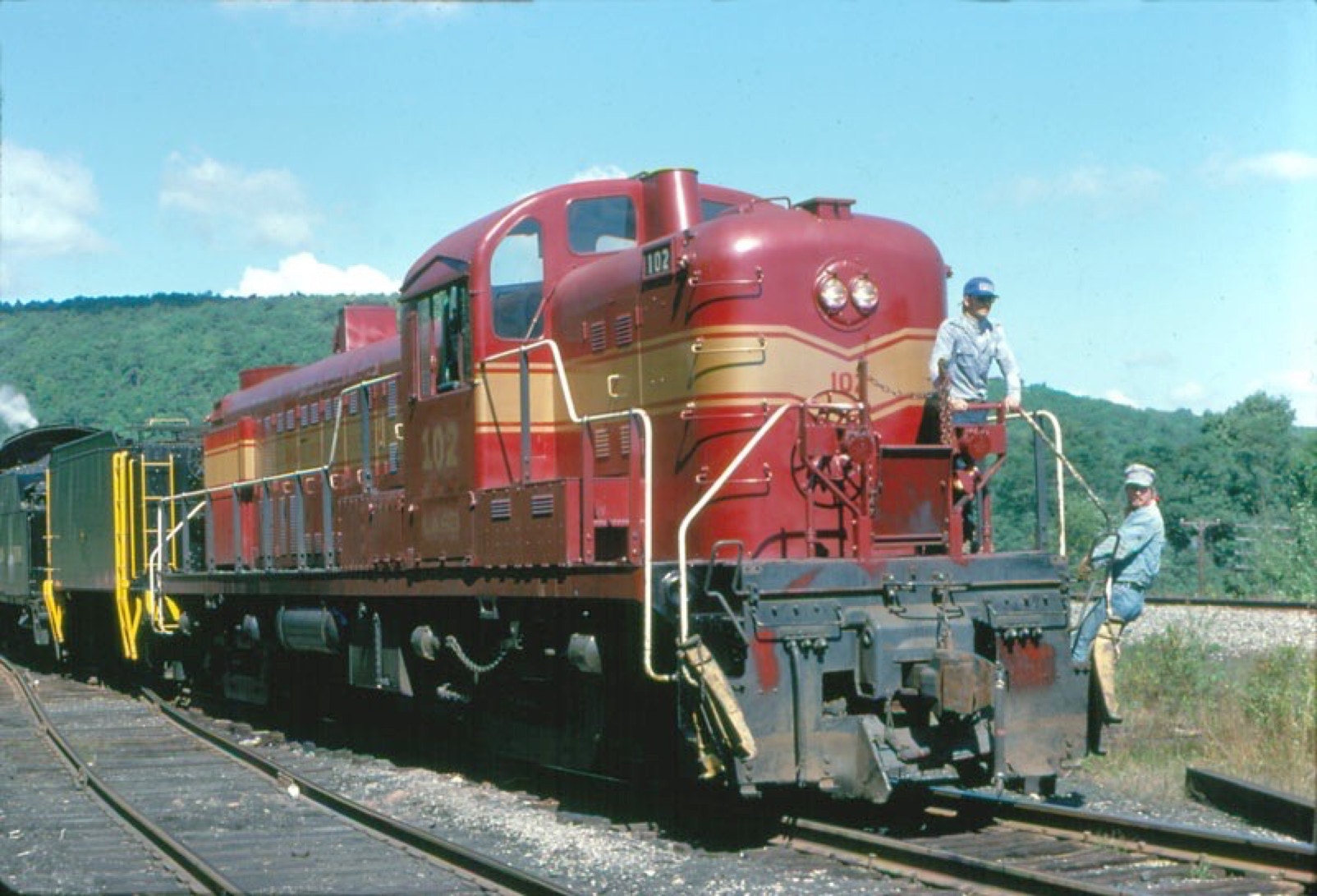 LASB 102 is shown here at Lackawaxen during the Storubridge Line 150th Anniversary celebration, assisting George Hart's former CP 4-6-0 972 on excursions. 102 had just been painted maroon and gold at this time, becoming the first DO